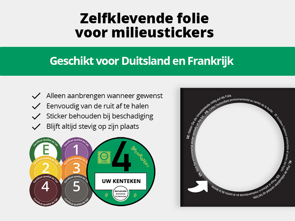Hoe werkt het? Wanneer je de levering ontvangt, bevestig je de Duitse milieusticker op de zelfhechtende folie. Vervolgens breng je de folie, samen met de sticker, aan op de juiste plek op de voorruit.